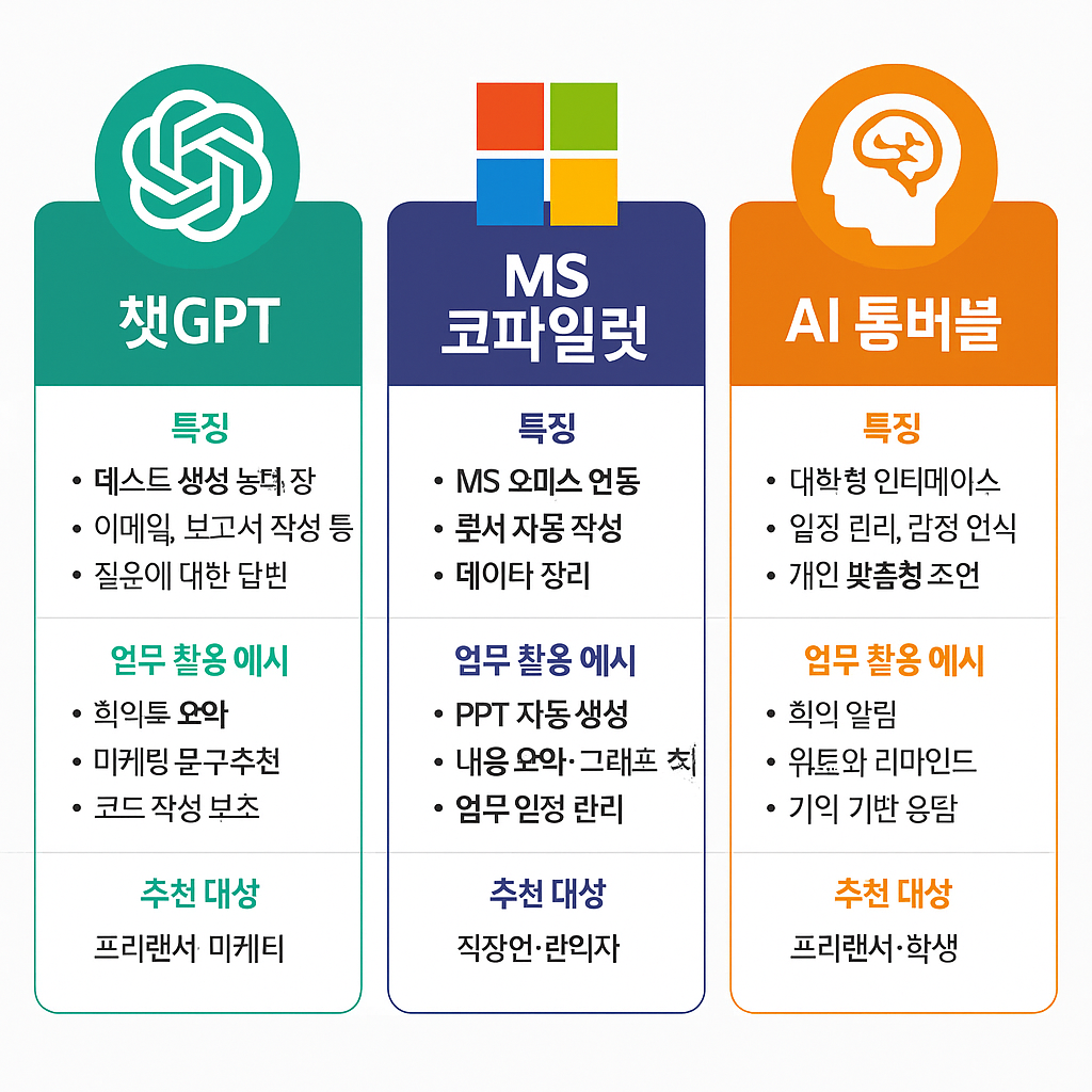 | 핵심 기능 | 텍스트 생성, 질문 응답 | 오피스 문서 자동화 | 대화형 일정·감정 보조 |